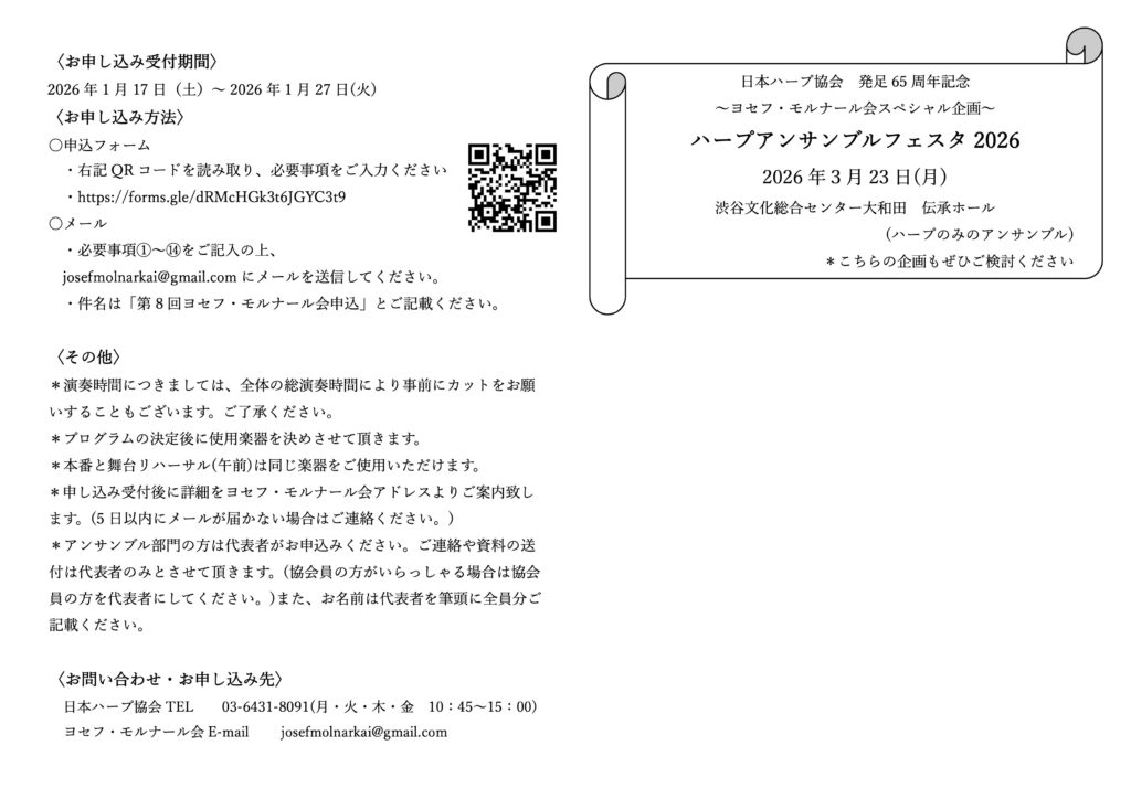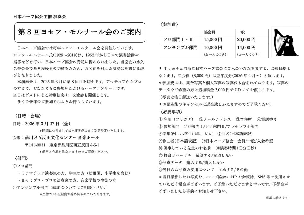 ・お申し込みと同時に日本ハープ協会へご入会いただきますと、会員価格となります。年会費(8,000円)は翌年度分(2026年4月から)といたします。