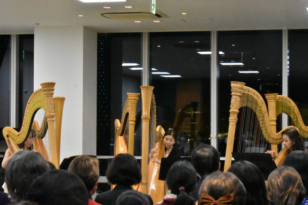 上野学園短期大学の教員、卒業生、学生による6台のハープ・アンサンブルに始まり、ハープとフルートの厳かな三重奏、ハープ3台による演奏が続きました。そして、最後はハープ6台とフルート7人のアンサンブル「美しく青きドナウ」です。フルートは通常のフルートに加え、アルトフルート、バスフルート、地図で北を示すマークのような形をした大きなコントラバスフルートも入りゴージャスな演奏となりました。