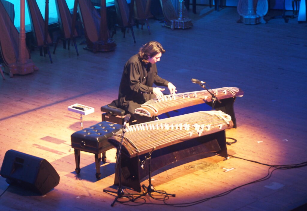 次は、伝統楽器の箏と現代的なエレクトリックハープの共演です。おふたりの共演は初めてですが、昔からの相棒のように絶妙な掛け合いが繰り広げられました。幅広いジャンルの音楽やアーティストに触れ、親和性を高めるふたりの音楽は、ライブハウスで即興のセッションを聴いているかのようでした。