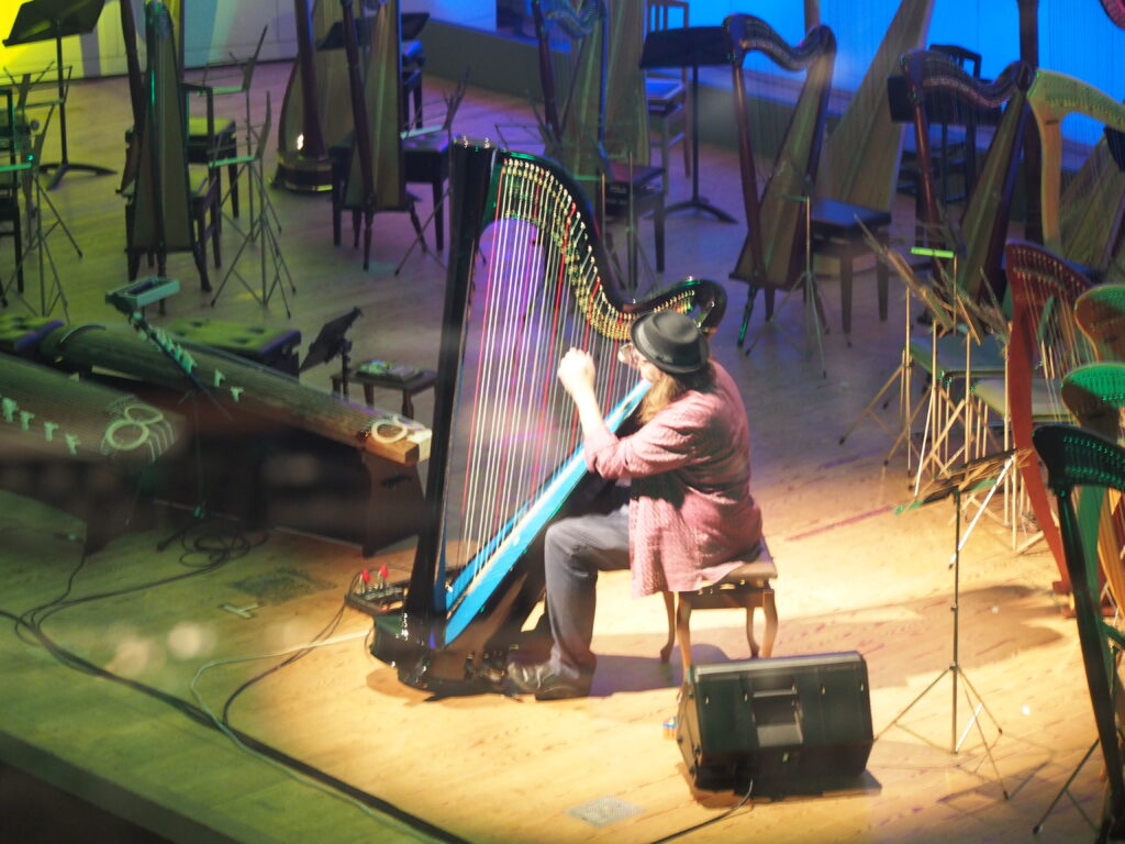 ブルーの共鳴板のエレクトリックハープと、ハットを被ったパーク・スティックニーが登場。従来のハープという楽器とハーピストのイメージを一掃するかのような出立で、これまた先入観を覆す演奏に、瞬時に会場のお客様はパーク・スティックニーの虜に。左手でルービックキューブを操りながら、右手で自身作曲の「キュービック・ルーブ」を演奏するという離れ技も披露してくれました。「かっこよくなりたい」から始めた遊びが今ではエキスパートに。アルゴリズムの追求はパークの音楽への情熱とリンクしているかのようです。