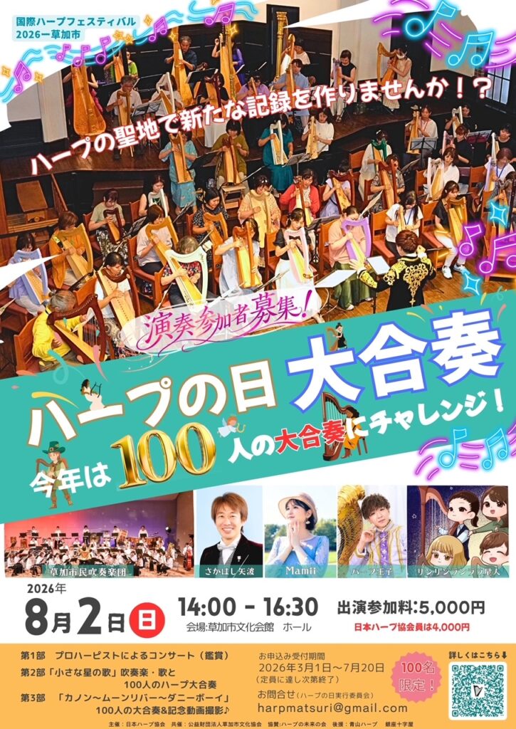2026年8月2日(日)、草加市文化会館ホールにて開催される「ハープの日 大合奏」で、みんなで大きな夢に挑戦しませんか?今まで開催してきたハープ大合奏の集大成として、2026年は100人大合奏にチャレンジ。日本のハープ界で新たな記録を生み出しましょう!